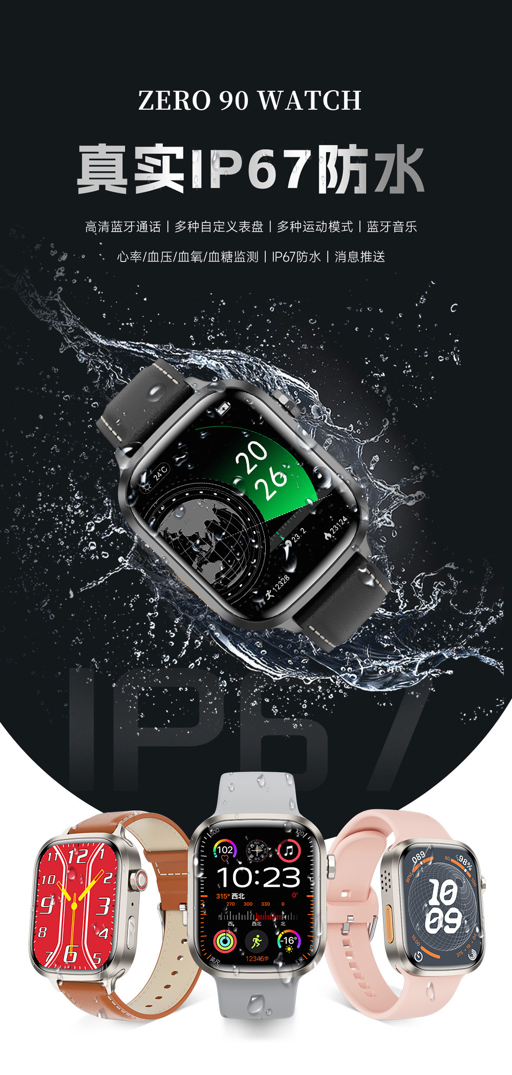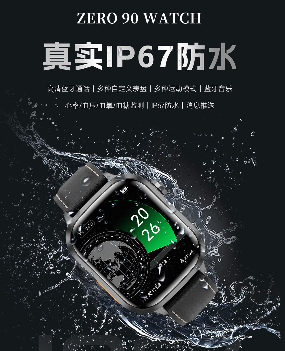 ZERO 90 WATCH真防水智能手表在设计上独具匠心,高清皮表带不仅质感上乘,而且舒适耐用,为佩戴者带来极致的佩戴体验。同时,手表的IP67级防水性能,意味着它可以在短暂的浸泡、雨水冲刷或日常洗手等情况下正常工作,无需担心水分对手表造成损害,大大拓展了其使用场景。